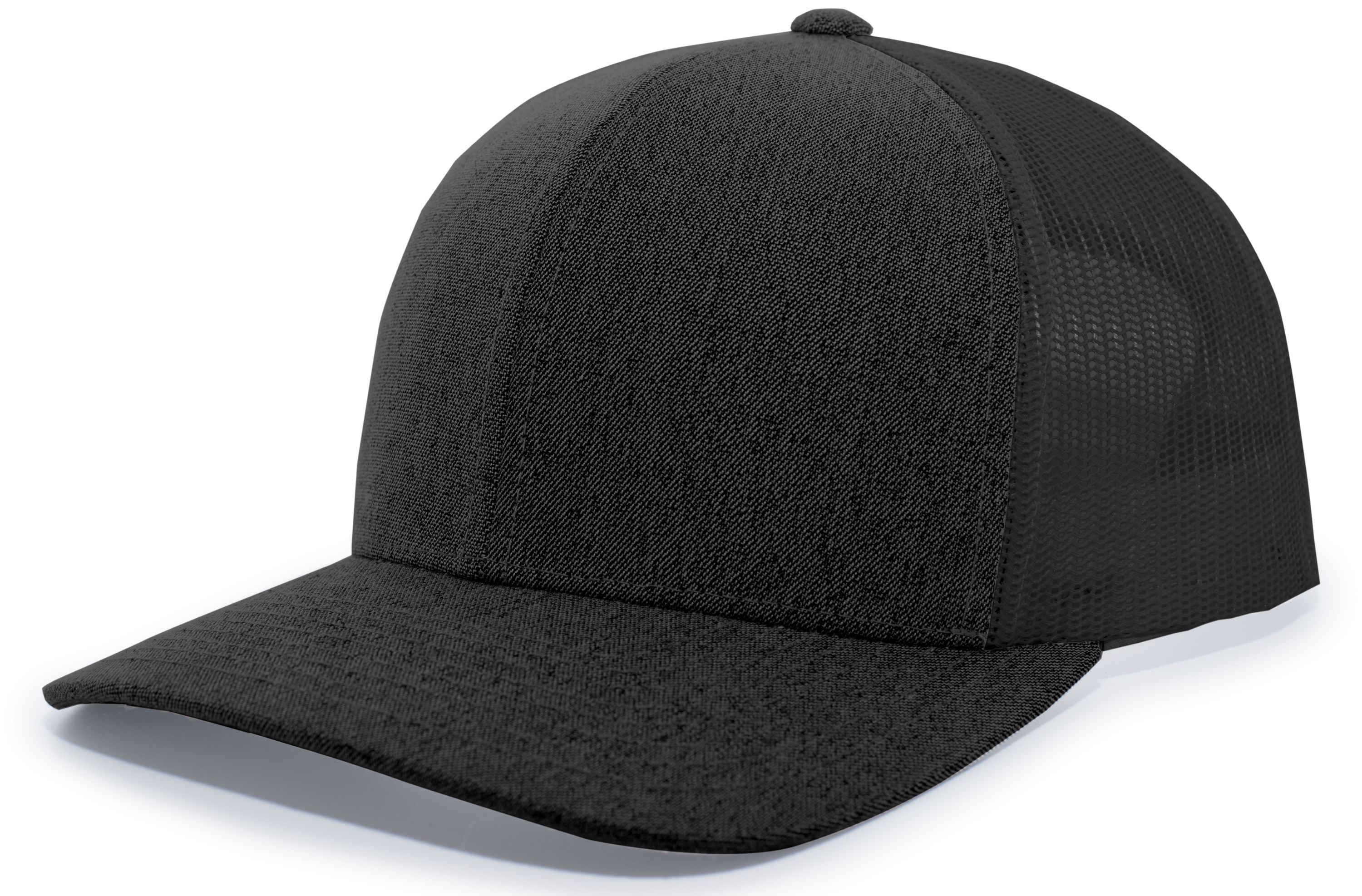 * Polyester/rayon * Trucker mesh * Melange heather fabric * Mid-profile * Pro-model * Slight curved visor * Black or Grey undervisor * Pro-stitched finish * Snapback adjustable