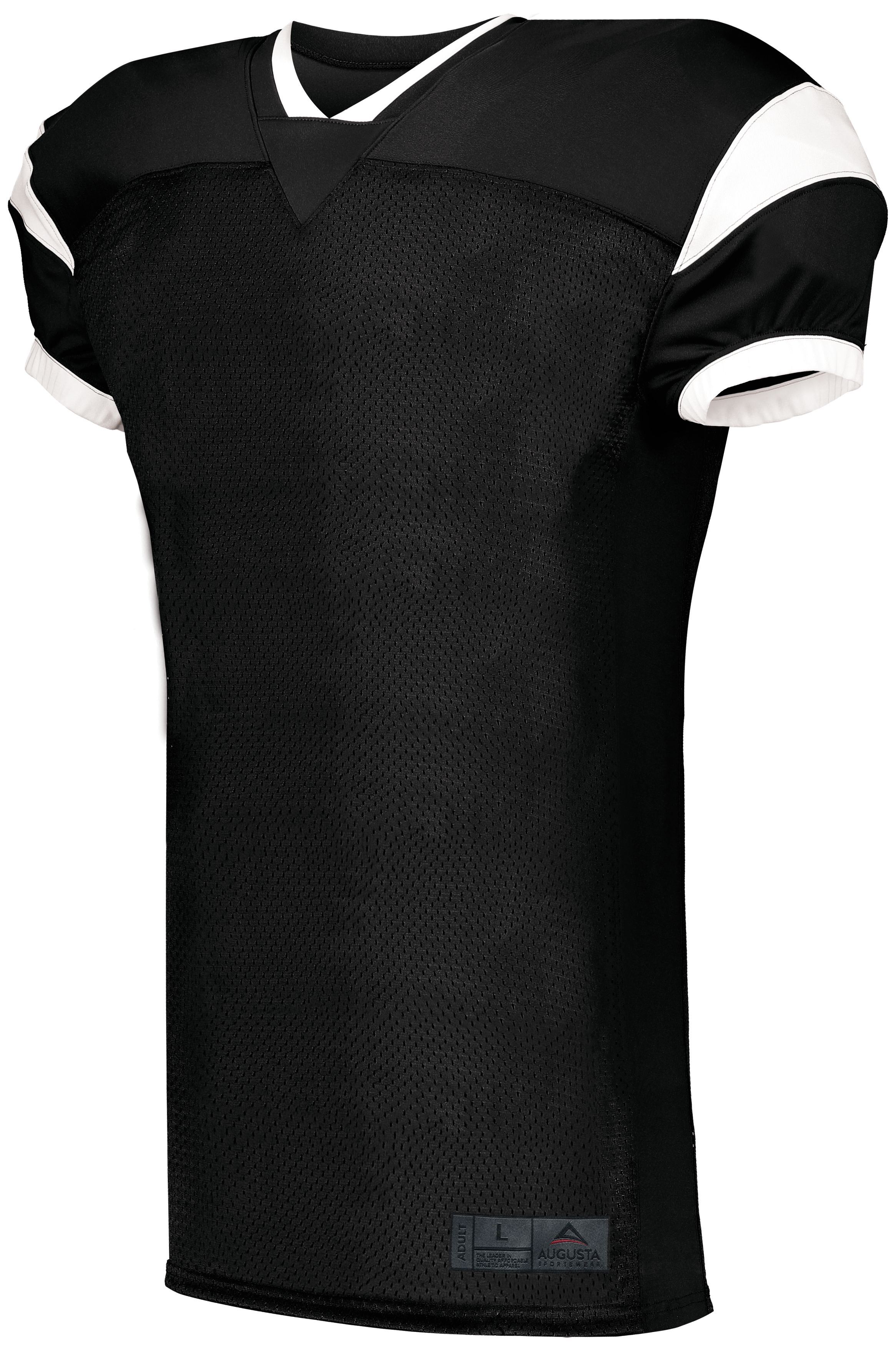 100% polyester heavyweight tricot mesh body * 90% polyester/10% spandex 2-ply yoke, sleeves and side inserts * Updated fit to accommodate traditional and slimmer pads * Outside locker label * V-neck collar with center front insert * Contrast color cap sleeves with contrast color half-elastic cuffs for secure fit over pads
