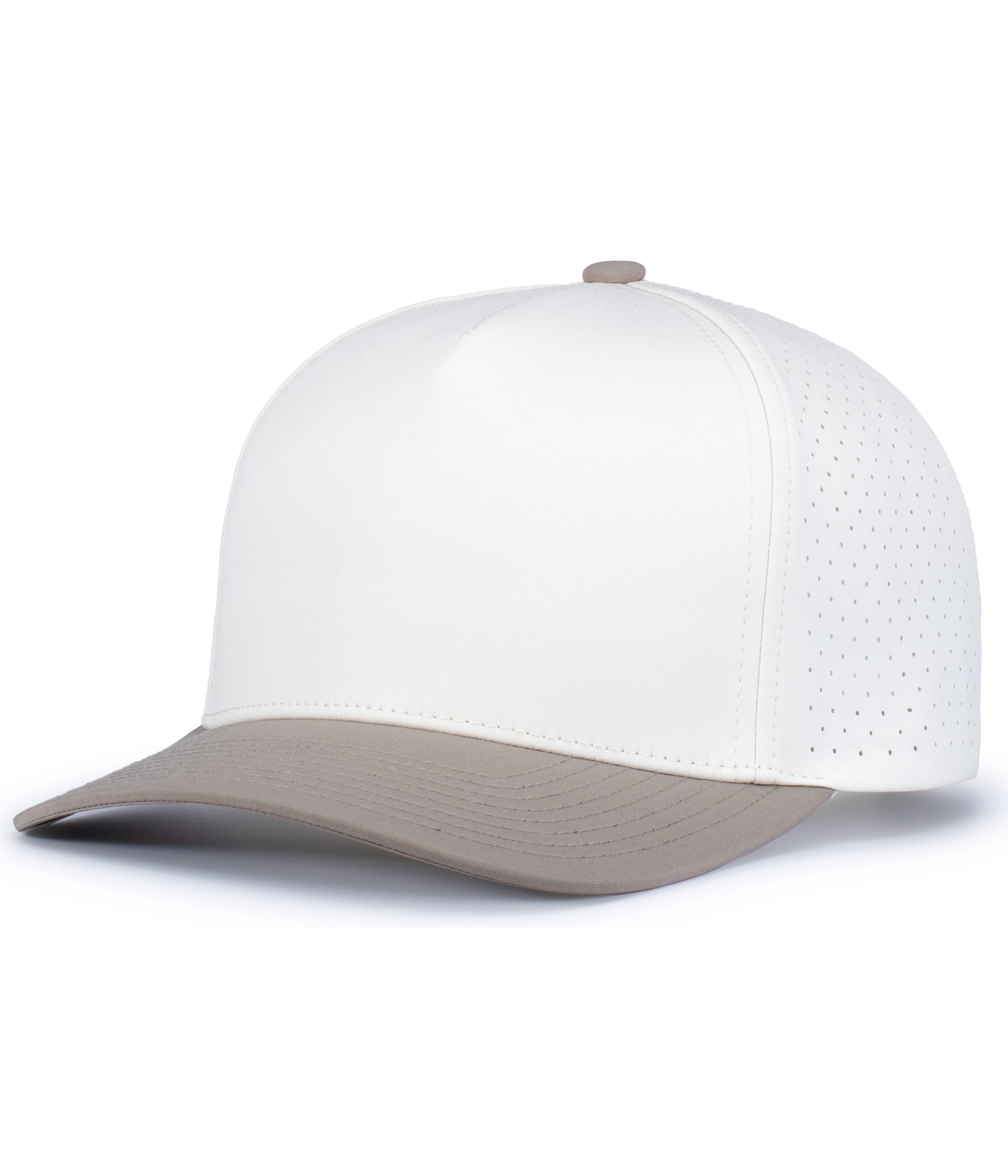 * Polyester/spandex woven * Perforated side and back panels for comfort and breathability * Mid-profile * 5-panel * Slight curved visor * Pro-stitched finish * Contrast color cording * Snapback adjustable