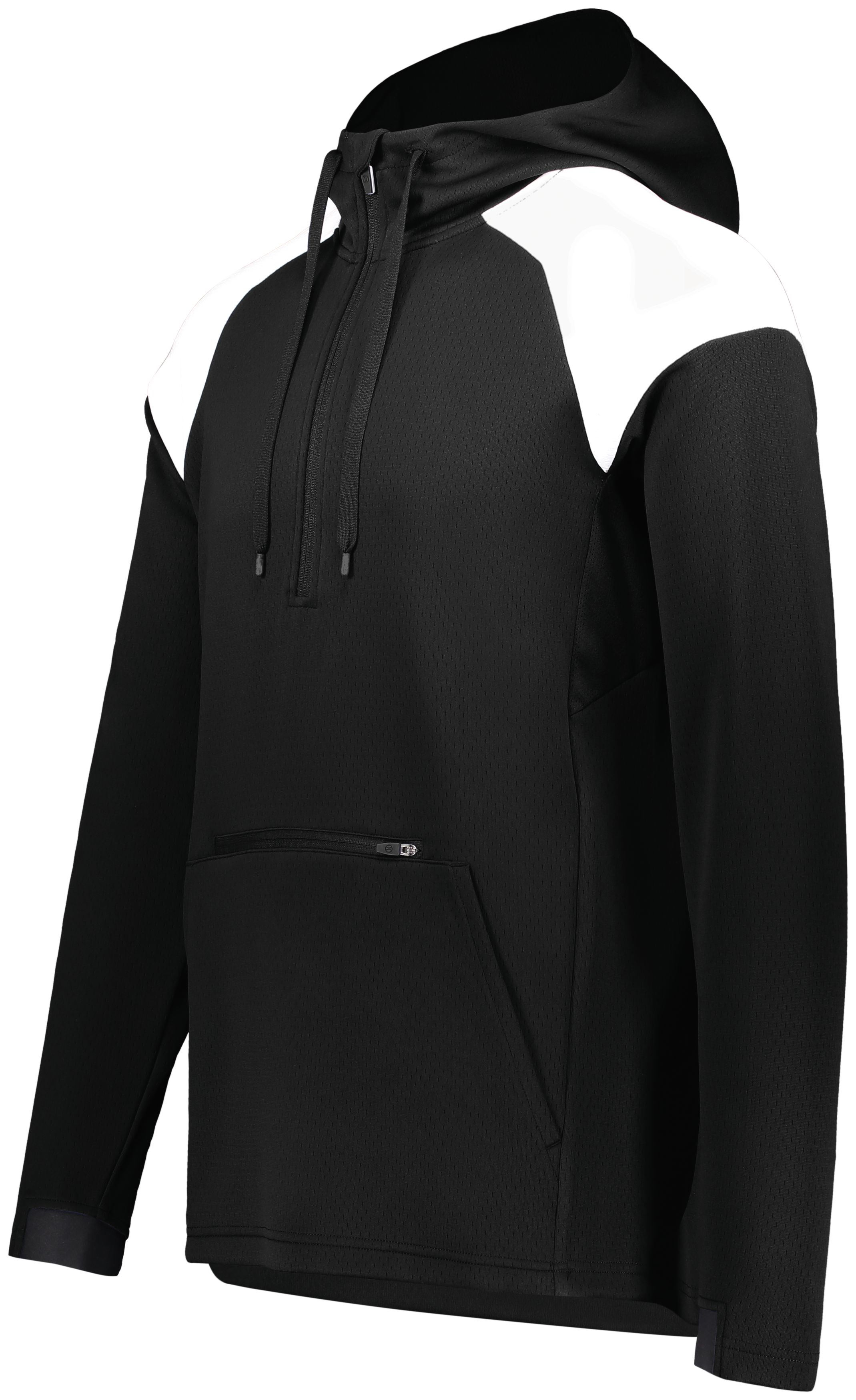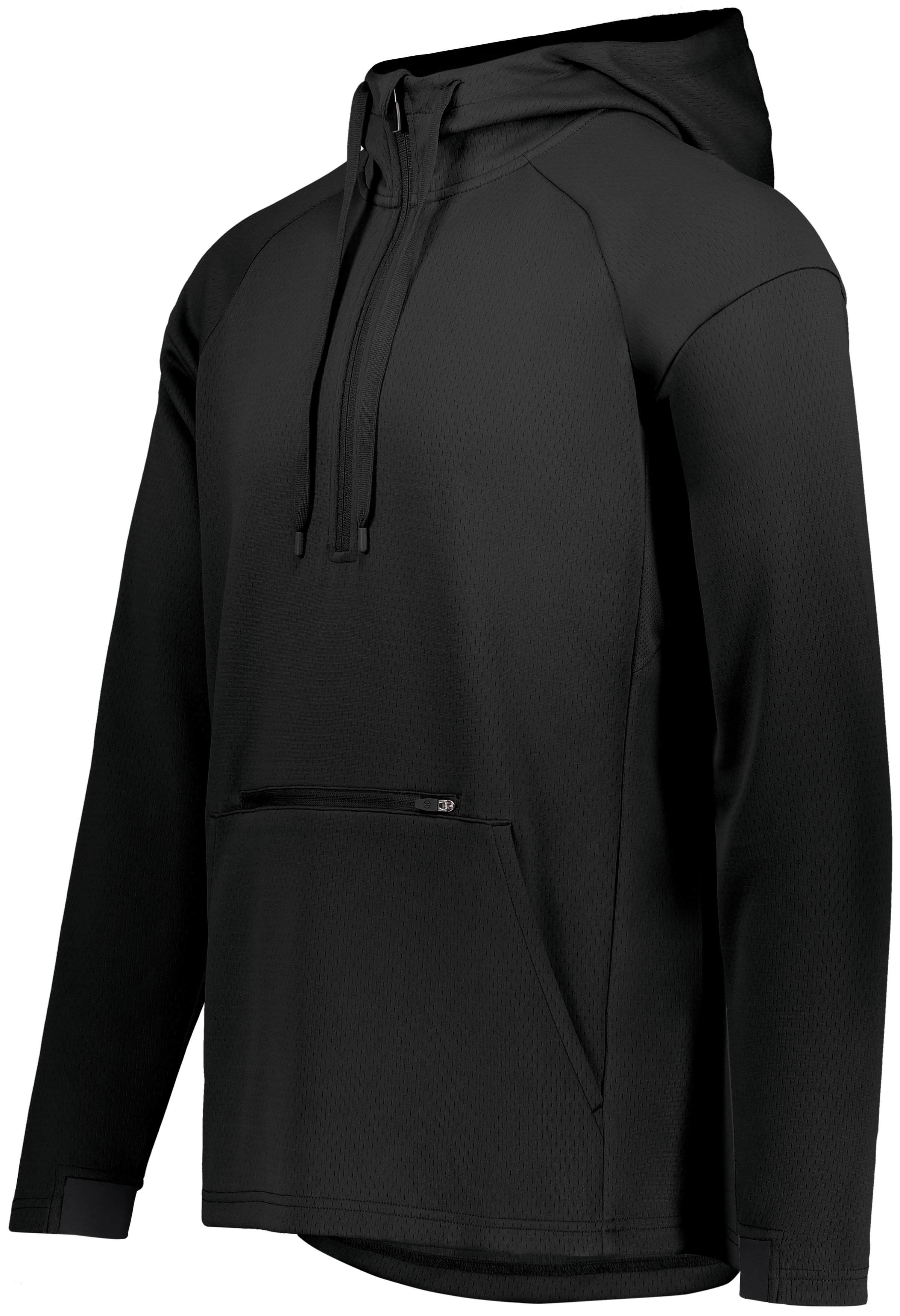 * Dry-Excel™ 100% polyester wicking double knit mesh texture * Wicks moisture * Woven label * High collar, half-zip pullover style with zipper garage and collar * Pinhole mesh lined hood with drawcord * Raglan sleeves for maximum mobility * Front zippered valuables pocket * Front pouch pocket * Half-elastic cuffs * Dropped tail
