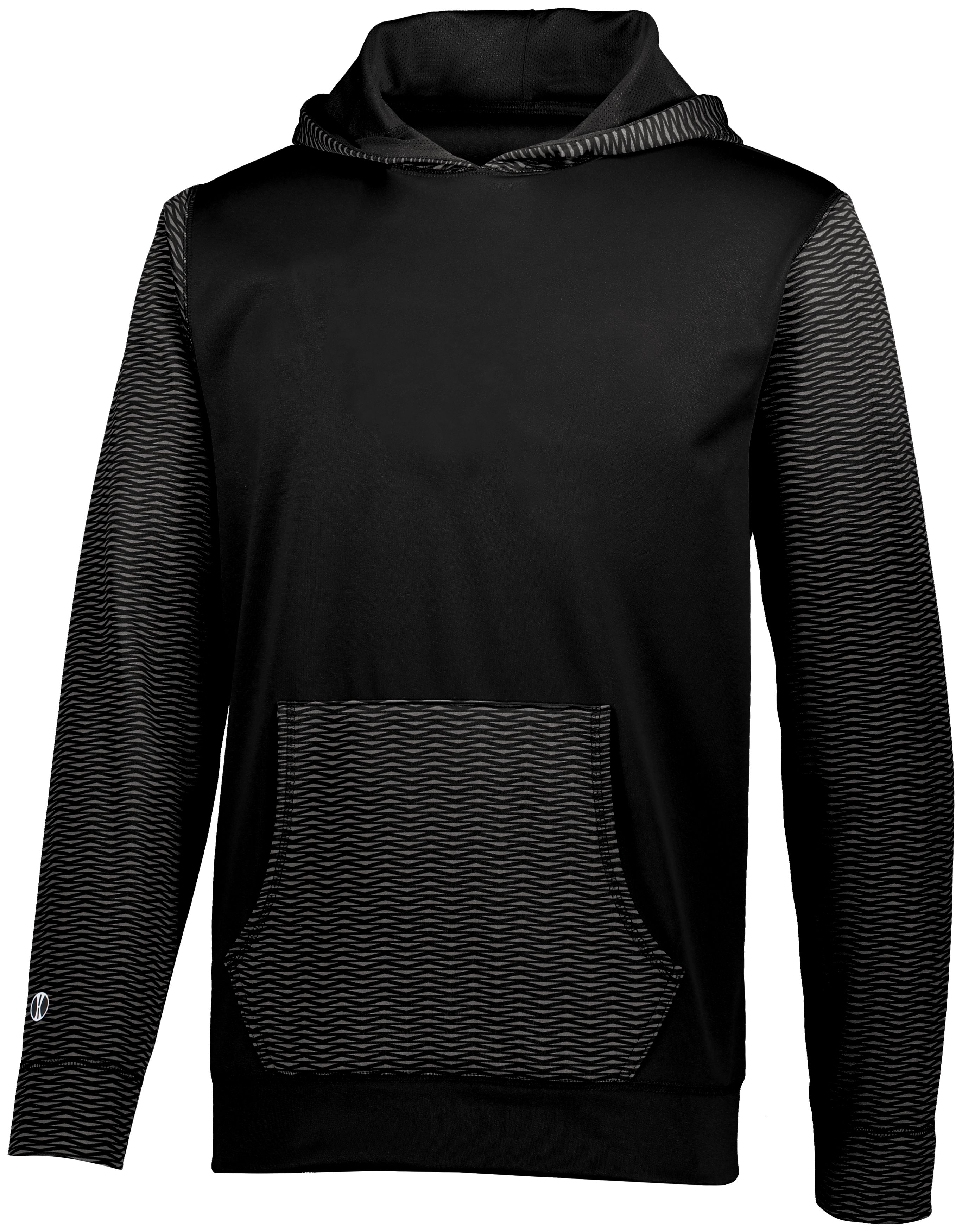 Dry-Excel™ 5.9 ounce 100% polyester performance wicking fleece features tonal tech weave print on hood, sleeves and pocket * Pattern is roller printed, making it decoration friendly * Wicks moisture * Tagless label * Pinhole mesh lined hood with thick drawcord and metal eyelets on Adult sizes only * Set-in sleeves * Front pouch pocket * Self-fabric cuffs and bottom band