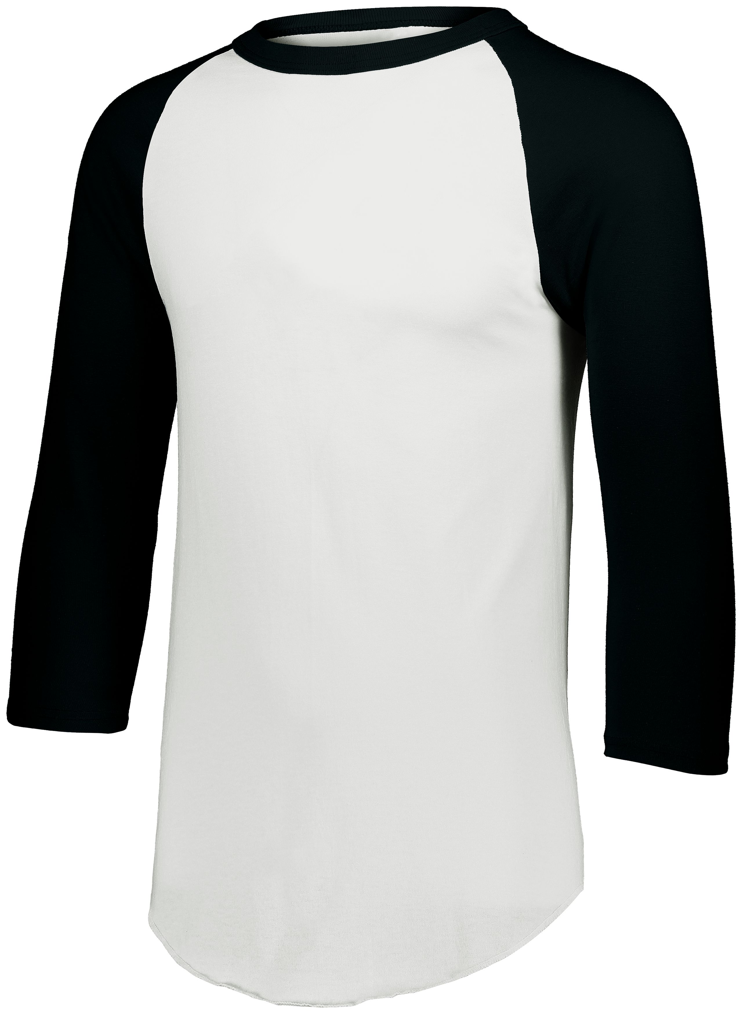 4.8 ounce 50% polyester/50% cotton jersey knit * Tear away label * Crew neck * 3/4" length raglan sleeves * Serged fishtail bottom