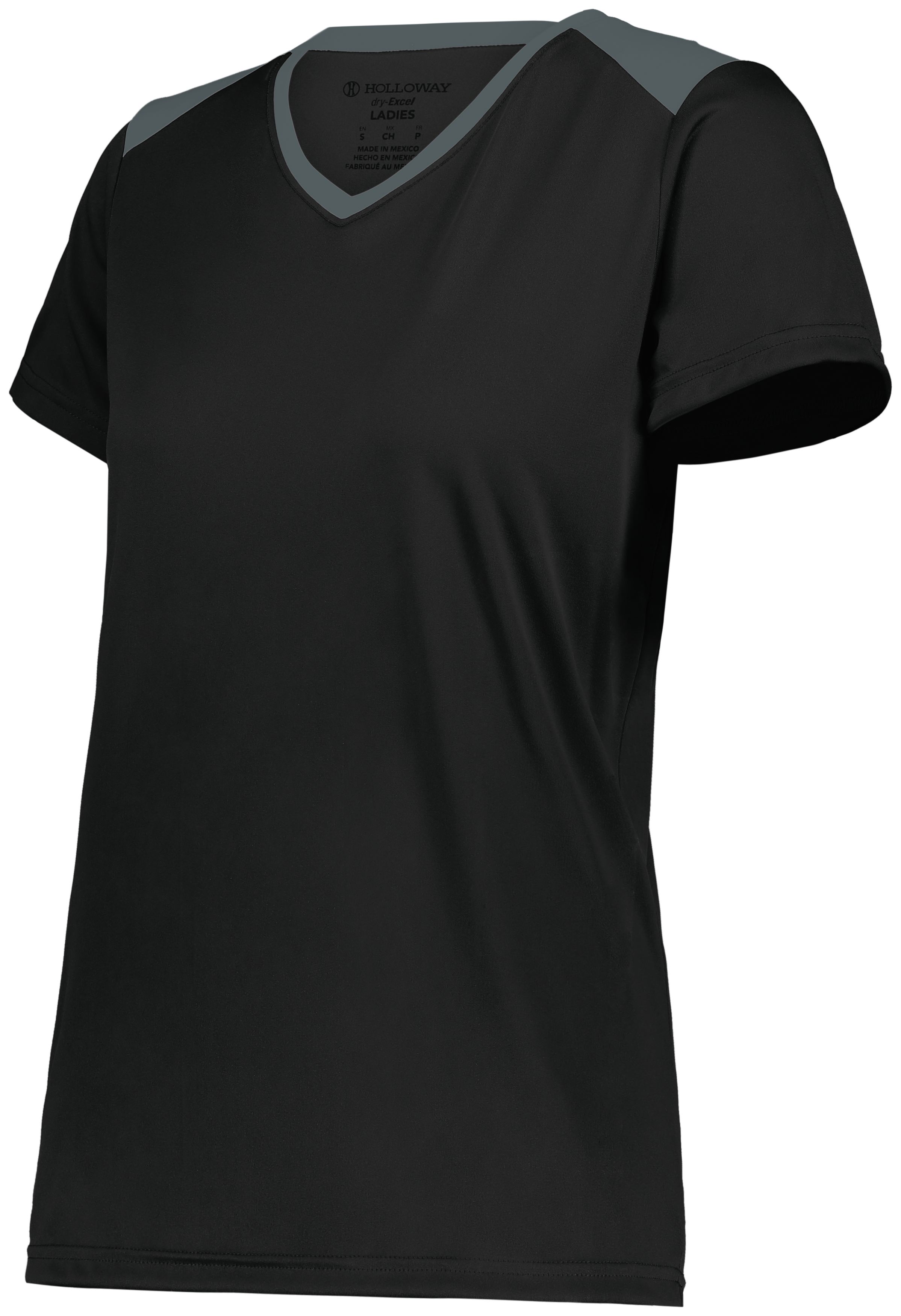 * Dry-Excel™ 100% polyester interlock smooth knit with color secure® technology that helps prevent dye migration * Wicks moisture * Odor resistant * Ladies' fit * Tag-free label * V-neck collar * Garment protects against the sun with 45+ UPF * Set-in sleeves